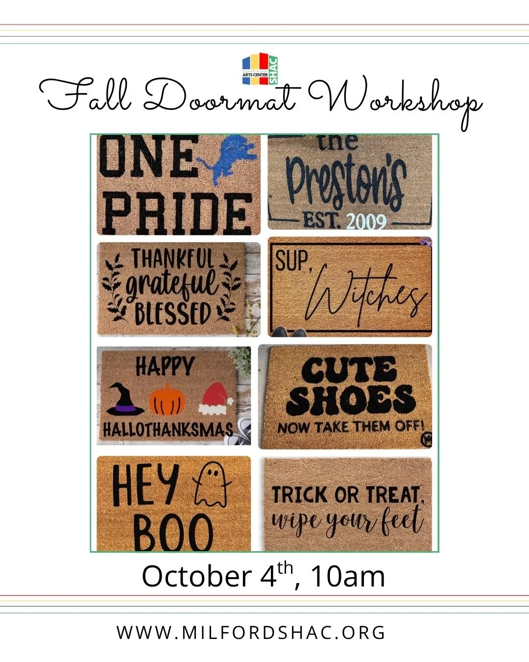 Join us for a super fun Paint Your Own Doormat Workshop — choose from a variety of awesome designs, pick your favorite colors, and create a one-of-a-kind welcome mat that’s so you.