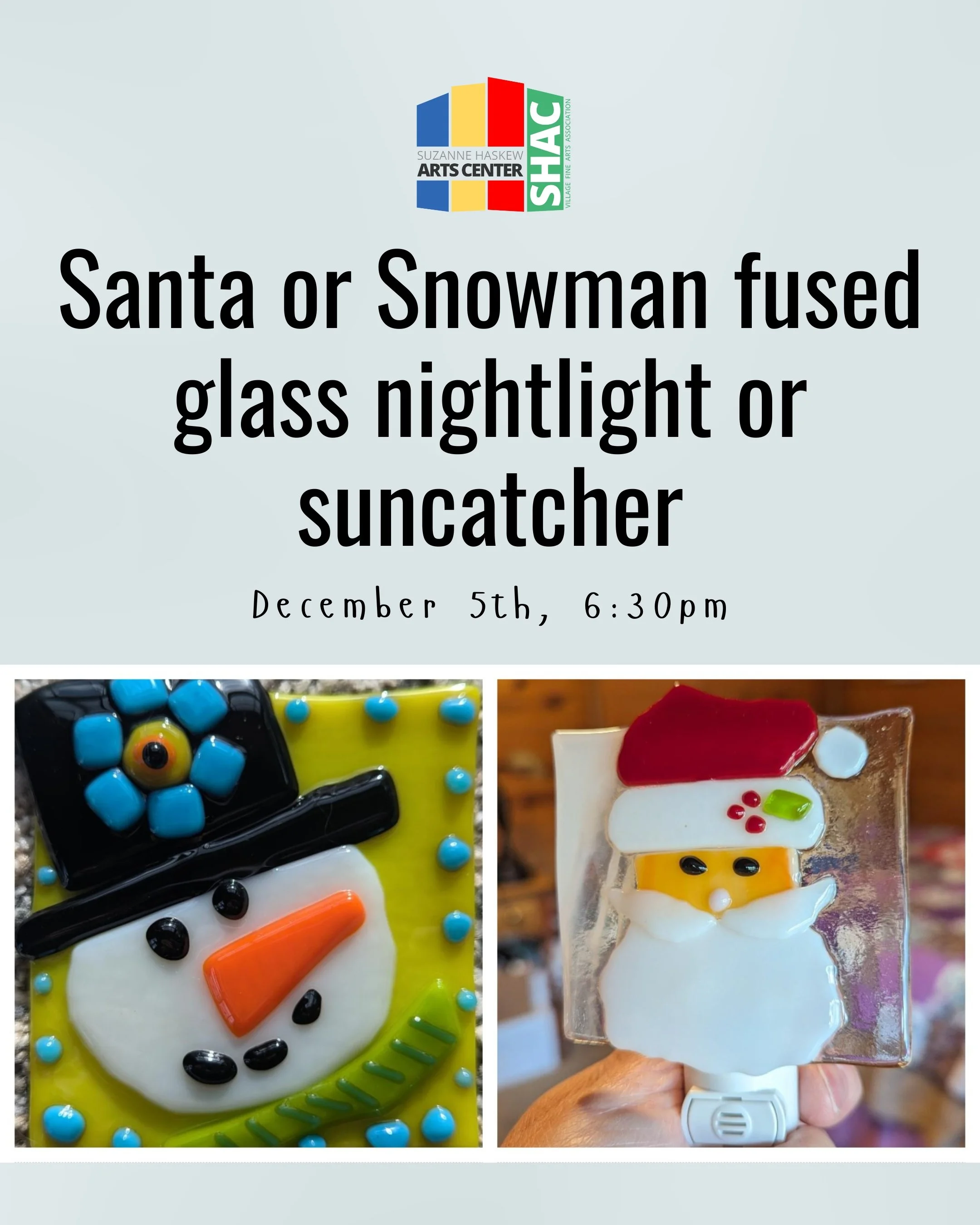 🎄✨ Get into the holiday spirit with our Fused Glass Snowman or Santa Workshop! ✨🎄