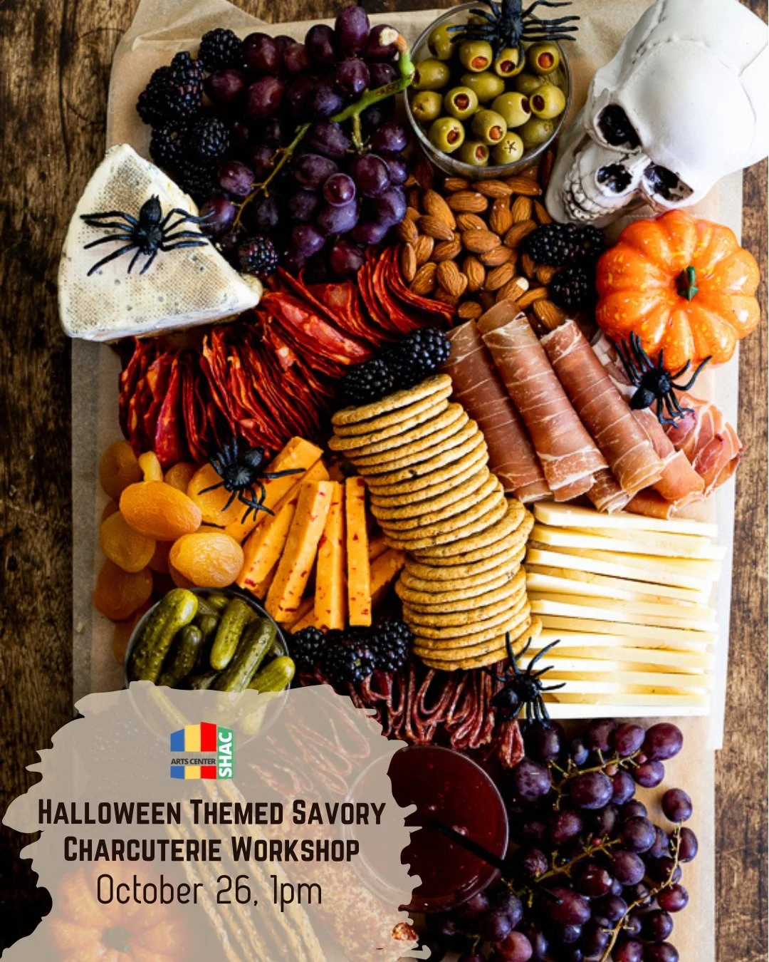 Join us for a Halloween-themed Savory Charcuterie Class in collaboration with Jars and Sweets by Ashley! You'll create a festive (and tasty!) mini version of the spooky charcuterie board pictured — complete with themed decor and all the delicious fixings.