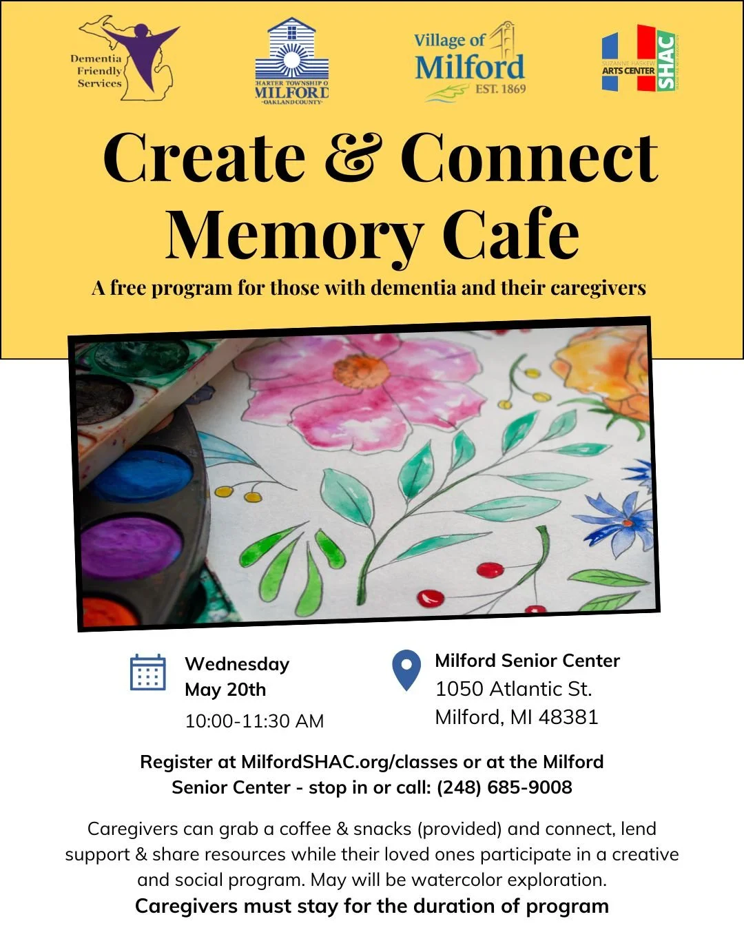 This is a free program for those with dementia and their caregivers. Caregivers can grab a coffee, connect, share stories and support one another while their loved one participates in a creative and social activity. This takes place at the Milford Senior Center (1050 Atlantic Street, Milford) *Caregivers must stay inside the building for the duration of class.