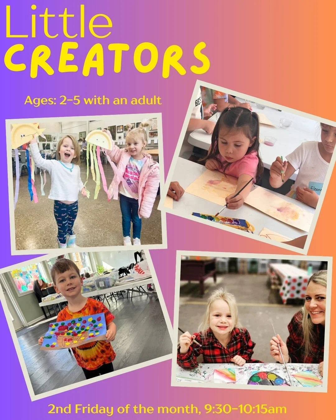 Ages 2-5 years old. Parent-Tot Art Class. CREATE and PLAY. We will have different stations for children to choose from. There will be both planned art projects stations and open-ended creation stations. Please dress for mess! Adult stays with child for duration of class. Register for each child who will be attending.